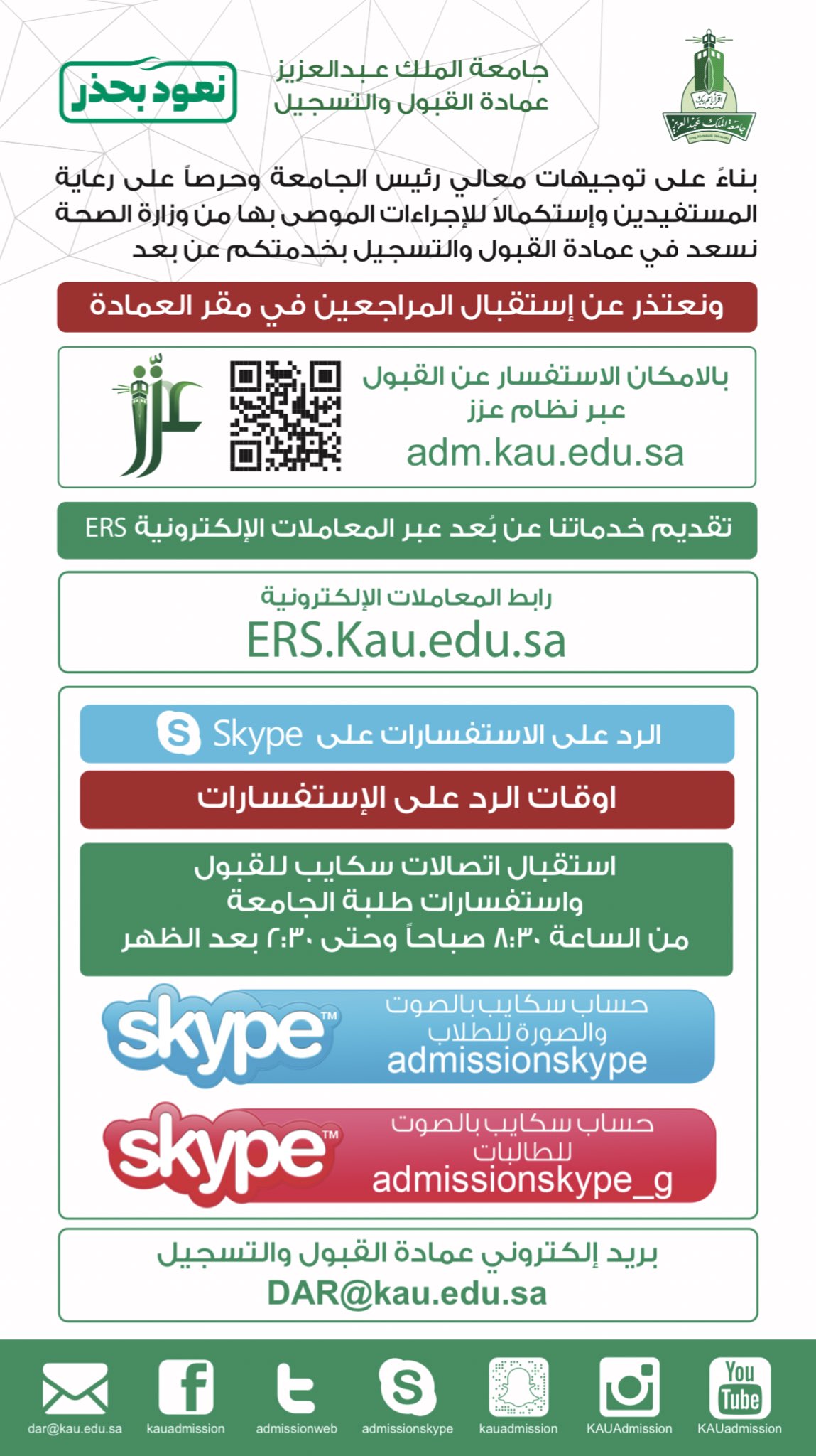 عمادة القبول والتسجيل Kau On Twitter تسعد العمادة بـ جامعة الملك عبدالعزيز استمرار الرد على استفسارات المرشحين للقبول ومعاملات طلبة الجامعة والمستفيدين وذلك عن بعد عبر وسائل التواصل الإلكتروني المختلفة وتعتذر عن استقبال